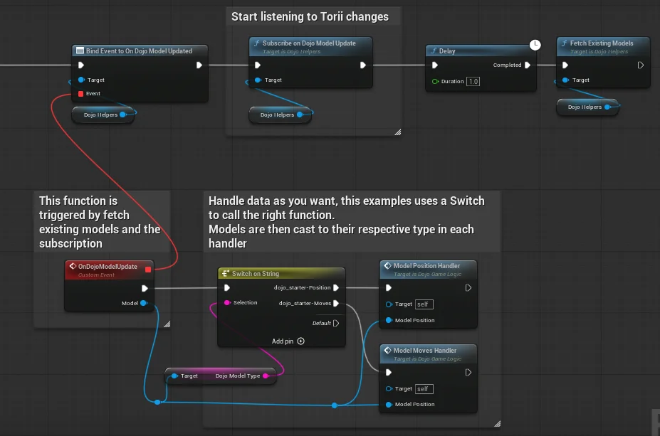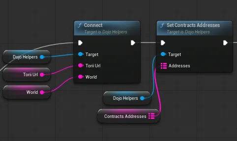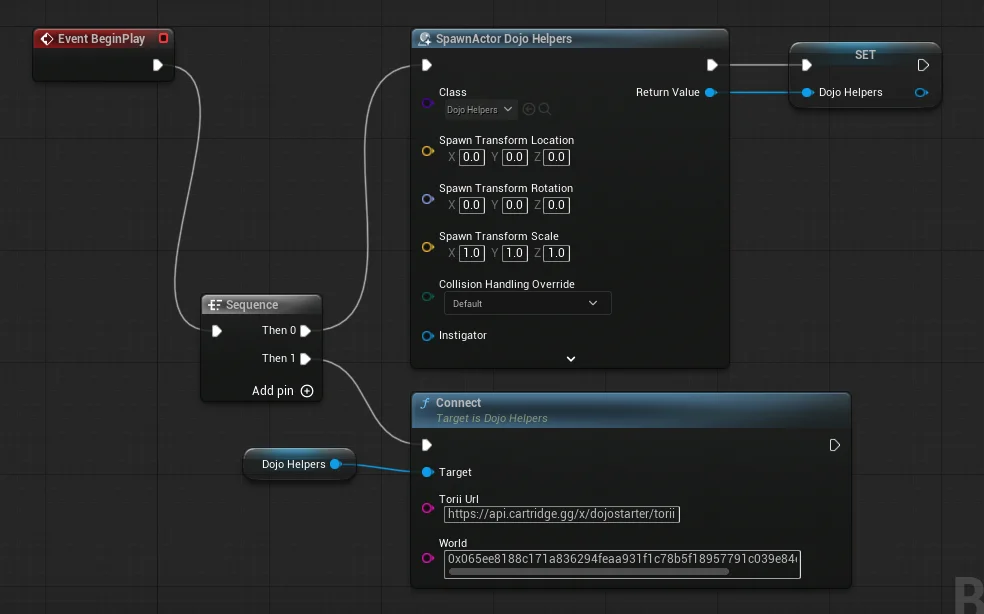 These files use the Dojo plugin and expose simple functions that you can use from another cpp file or directly from a Blueprint. If you have set up everything correctly, you will have a connected Torii client in a Blueprint.