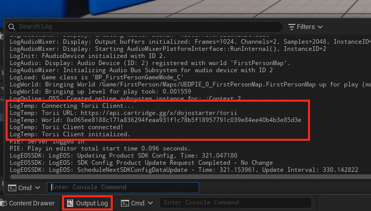 5. Launch the game and verify the connection in the Output Log unrealtoriiconnected